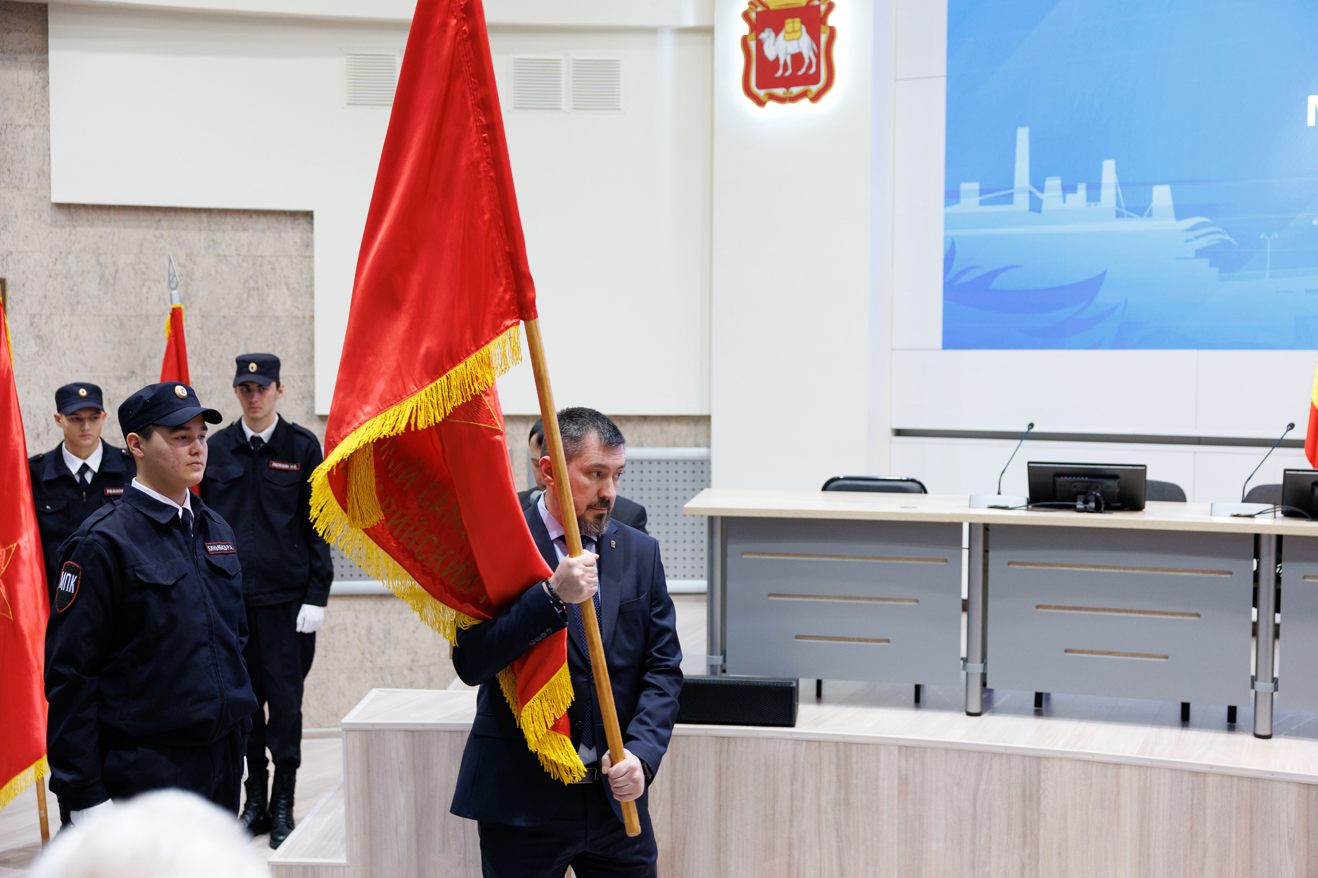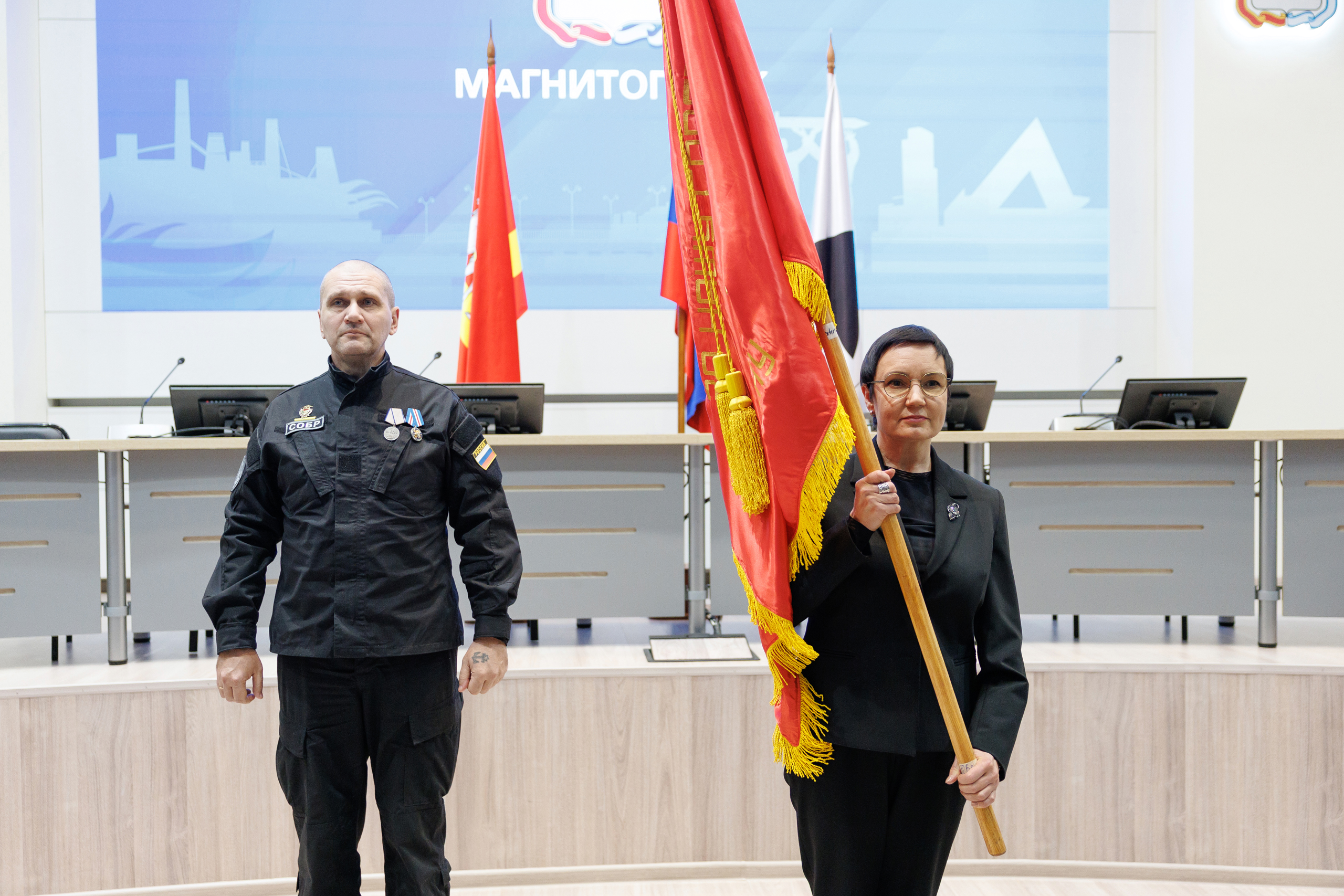 Копию боевого знамени 1548-го тяжелого самоходно-артиллерийского полка Денис Моисеев передал генеральному директору публичного акционерного общества «Магнитогорский металлургический комбинат», заместителю председателя Законодательного Собрания Павлу Шиляеву.